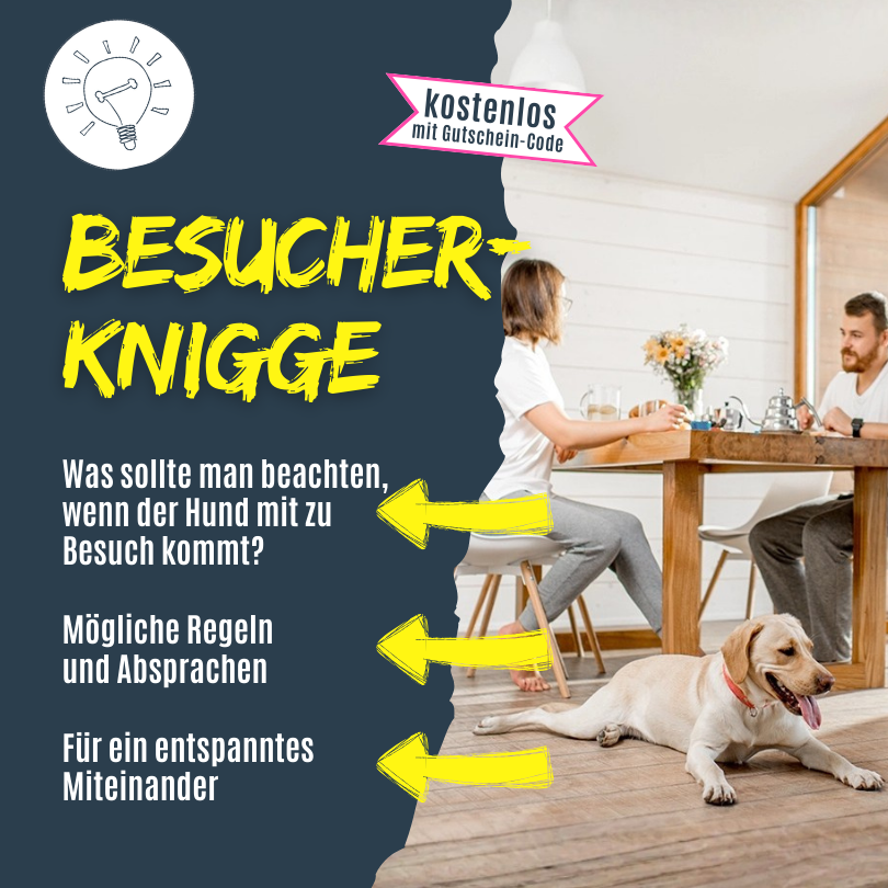 Wie der Hund sich zu verhalten hat, wird oft schon im Welpenalter, spätestens als Junghund festgelegt. Was aber ist mit unserem Verhalten als Mensch? Welche Regeln und Absprachen sollten vor und während des Besuchs getroffen werden? Damit der Besuch bei Verwandten und Freunden auch mit Hund entspannt verläuft und man ein gern gesehener Gast ist, haben wir hier einen Besuchs-Knigge erstellt. Du kannst den Besuchs-Knigge gerne an deine Kunden weiterleiten.