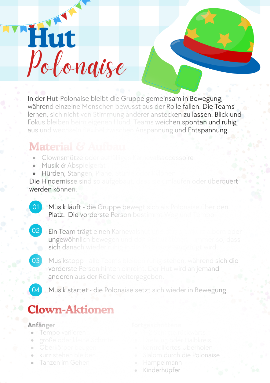 Weil die „Leinen Clown“-Übung so gut bei euch angekommen ist, haben wir spontan noch eine neue Gruppenübung für den Karneval in deiner Hundeschule kreiert.