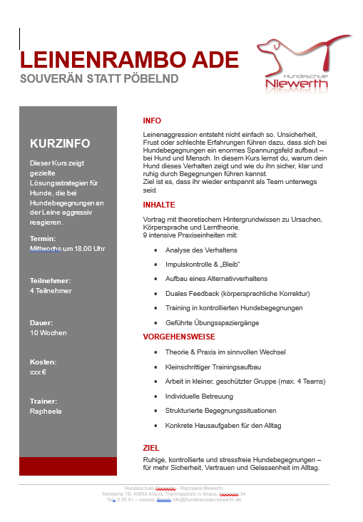 Einen Text zur Kursbeschreibung mit allen wichtigen Infos zum Kurs „Leinenrambo adé“ kannst du direkt im internen Bereich rauskopieren.