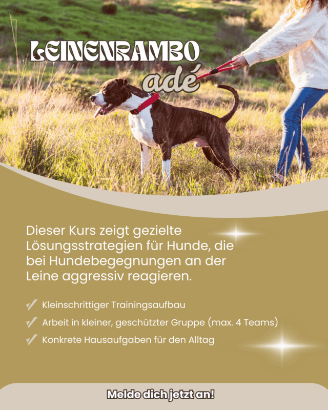 „Leinenrambo adé“ ist ein klar strukturiertes, praxiserprobtes Gruppenkonzept für Hundetrainer*innen, die Kund*innen mit leinenaggressiven oder stark reaktiven Hunden professionell, sicher und nachhaltig begleiten möchten.