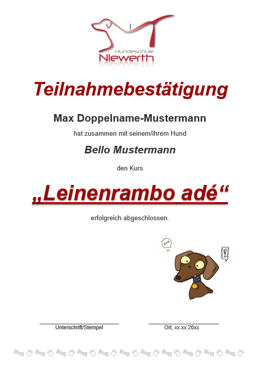 Meistens freuen sich die Menschen, wenn sie am Ende eines Kurses eine kleine Urkunde in den Händen halten. Du kannst die Urkunden im passenden Design einfach ausdrucken, den Namen des Teilnehmers und des Hundes eintragen und schon bist du fertig.