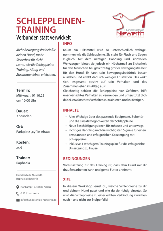 Das Handouts zum Schleppleinentraining haben wir dir als Worddokument vorbereitet. Ersetze einfach unser Logo durch deines und passe evtl. noch die Farben an – schon bist du fertig. Hast du Probleme mit der Gestaltung, sprich uns gerne an.