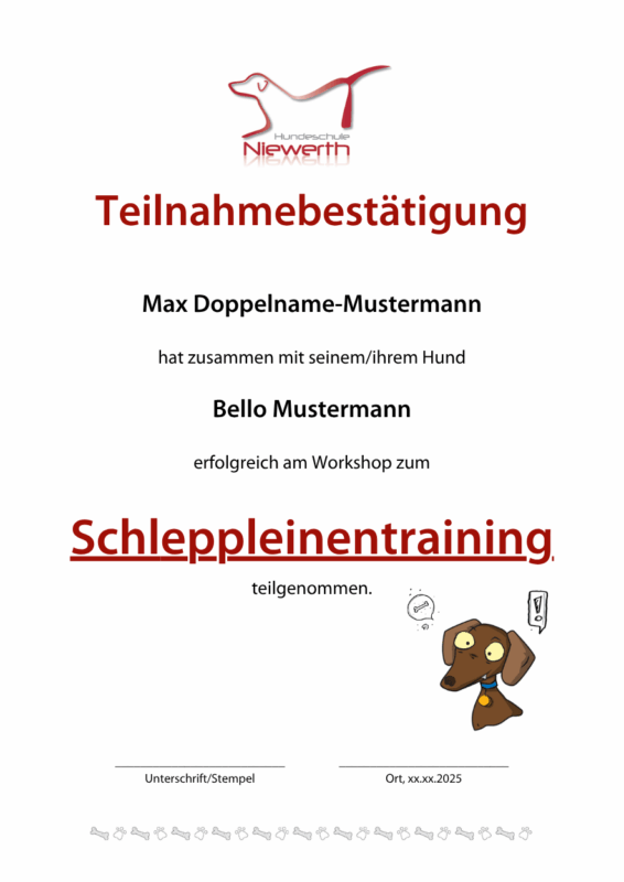 Meistens freuen sich die Menschen, wenn sie am Ende eines Workshops eine kleine Urkunde in den Händen halten. Du kannst die Urkunde im passenden Design einfach ausdrucken, den Namen des Teilnehmers und des Hundes eintragen und schon bist du fertig.