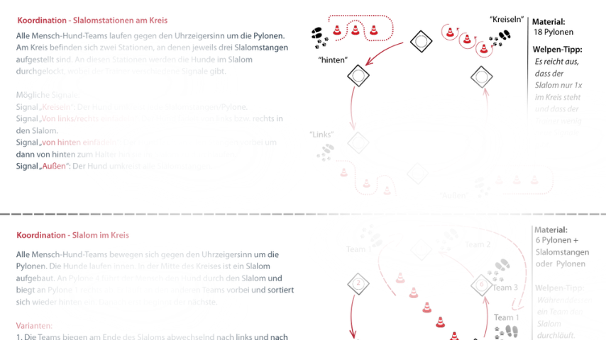 Hier bekommst du 6 Übungen mit Varianten für dein Training. Der Schwerpunkt liegt bei diesen Karten auf Koordinationsübungen im Slalomlaufen. Slalomtraining ist eine hervorragende Kombination aus Bewegungsarbeit und Kopfarbeit. Es fördert die Koordination, die Beweglichkeit der Wirbelsäule und die Körperkontrolle des Hundes. Durch die wiederholten Richtungswechsel wird die Muskulatur gleichmäßig beansprucht und die Körperwahrnehmung geschult. Gleichzeitig lernt der Hund, sich an der Bewegung des Menschen zu orientieren und fokussiert zu bleiben. Ein schöner Zusatz z. B. für deine Welpen- oder Junghundegruppen.