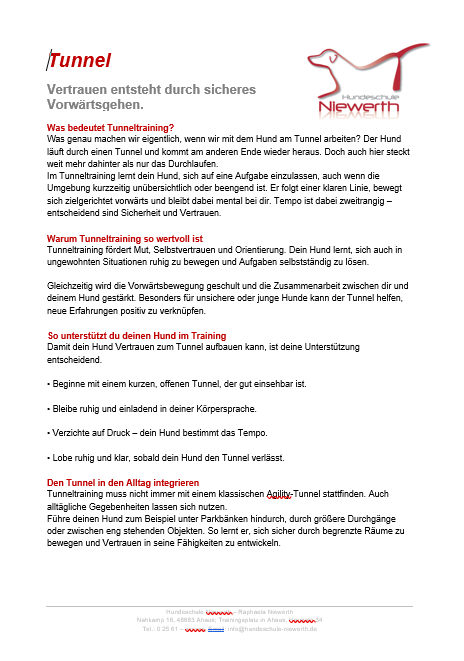 Hier bekommst du 6 Übungen mit Varianten für dein Training. Der Schwerpunkt liegt bei diesen Karten auf Koordinationsübungen mit einem Tunnel. Der Hund lernt, sich auf eine Aufgabe einzulassen, auch wenn die Umgebung kurzzeitig unübersichtlich oder beengend ist. Ein super Zusatz z. B. für deine Welpen- oder Junghundegruppen.