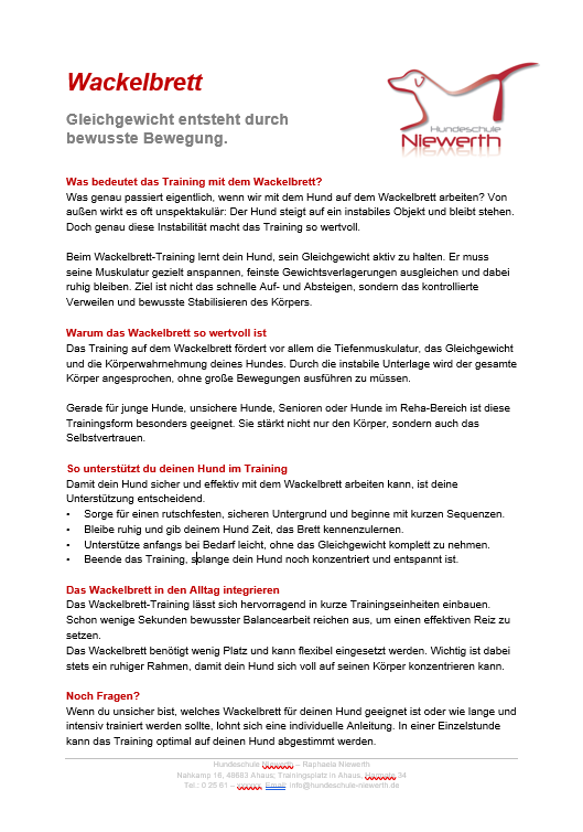 Hier bekommst du 6 Übungen mit Varianten für dein Training. Der Schwerpunkt liegt bei diesen Karten auf Koordinationsübungen mit Wackelbrett und Balance-Material. Beim Wackelbrett-Training lernt dein Hund, sein Gleichgewicht aktiv zu halten. Er muss seine Muskulatur gezielt anspannen, feinste Gewichtsverlagerungen ausgleichen und dabei ruhig bleiben. Ziel ist nicht das schnelle Auf- und Absteigen, sondern das kontrollierte Verweilen und bewusste Stabilisieren des Körpers. Ein schöner Zusatz z. B. für deine Welpen- oder Junghundegruppen.